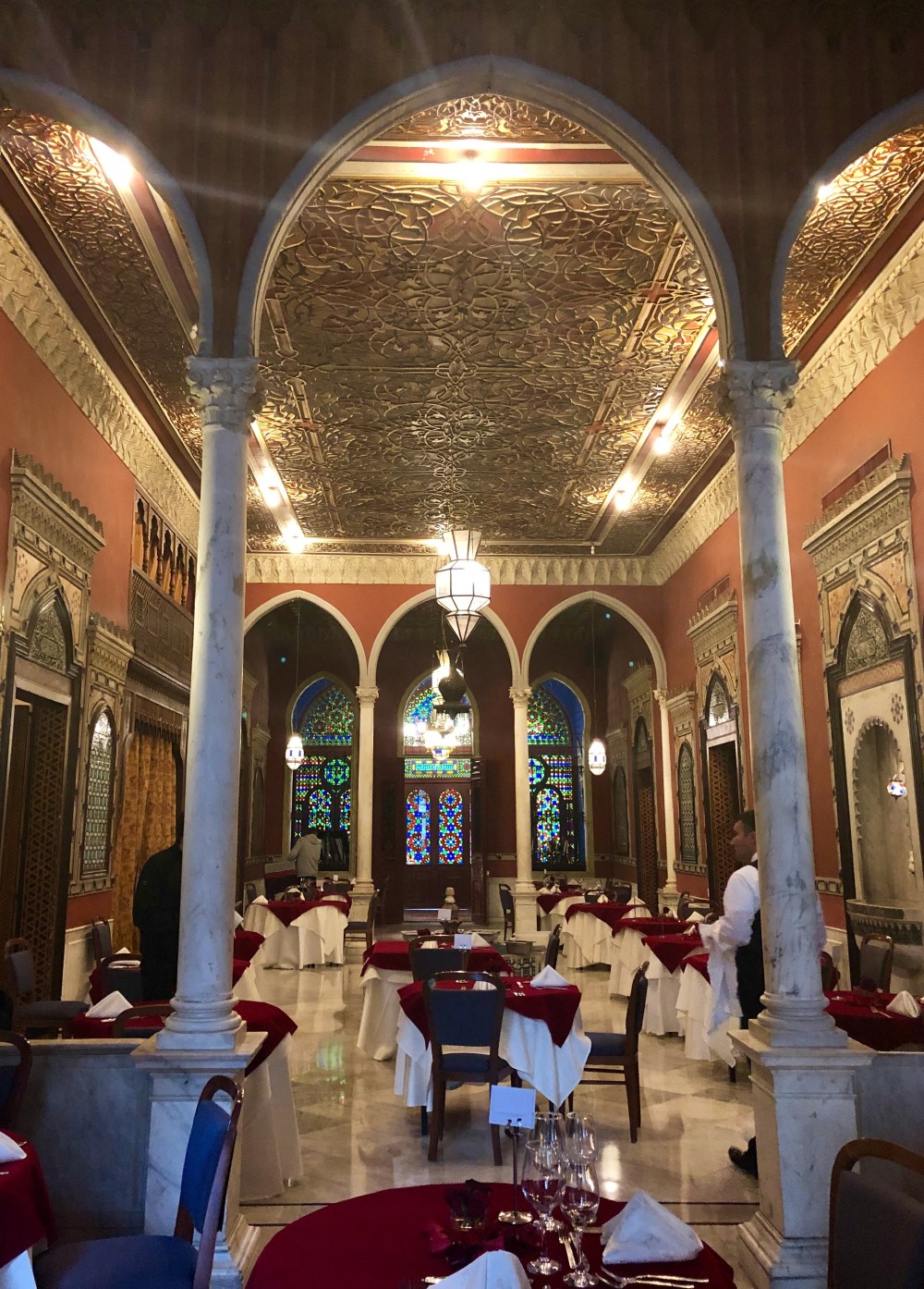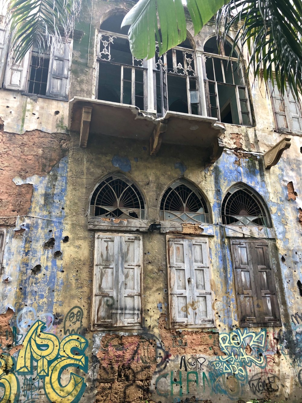 Mais à quelques pas de là, la ville reprend vie. Son histoire riche et mouvementée en fait une passionnante mosaïque culturelle et religieuse. Entre les Chrétiens de toutes tendances (catholiques, orthodoxes, maronites, coptes…) les musulmans chiites, sunnites, les druzes, les juifs…etc, 18 confessions s’y côtoient, sans s’y mélanger pour autant ne vous-y-trompez pas, et dans un périmètre très restreint on trouve mosquées, églises, cathédrales, temples, autant de lieux de culte pour chacun de ces dogmes. Le chant des muezzins se mêle aux carillons des cloches, formidable carrefour d’ascendances variées, de cultures et de croyances, c’est ce Beyrouth là qui me charme. D’une rue à une autre, je découvre le musée Sursock, dont l’architecture mélange styles vénitien et ottoman. A quelques pas, la villa Linda Sursock, privatisée pour un événement mais dans laquelle j’arrive à me glisser discrètement au milieu des préparatifs pour prendre quelques photos. L’hôtel Albergo, superbe Relais et Château à l’architecture traditionnelle libanaise . L’Oeuf ou le Dôme, comme on l’appelle, cinéma des années 50 détruit par la guerre. La mosquée Mohammad Al-Amin, la cathédrale St. Georges des Maronites et son campanile de 70m de haut, la cathédrale St Georges des grecs orthodoxes, le souk… Et à chaque coin de rue, un nouvel univers, un autre Beyrouth. Une villa luxueuse surgit au milieu d’un dédale de ruelles sales. Des graffs polychromes tranchent la grisaille des murs mornes. D’une hideuse décharge sauvage, on aperçoit la mer émeraude. Sur un trottoir, des check points et des militaires surveillent que vous ne preniez pas de photos d’un porte-avion amarré au large, quand, sur le trottoir d’en face, des fenêtres de restaurants et de chambres d’hôtels de standing offrent une vue plongeante sur le vaisseau.