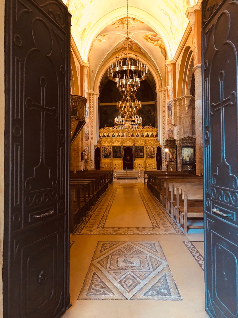 Ci dessous : La très belle Cathédrale St Georges des grecs orthodoxes. Elle fut construite en 1080 sur la structure d’une église des croisés, elle même élevée sur les vestiges d’une église byzantine datant de 550. Le sol en mosaïques est fait à partir des médaillons de pierre issus de l’église byzantine. La Cathédrale fut pillée et saccagée pendant la guerre du Liban comme en témoignent les impacts de balles sur les peintures.