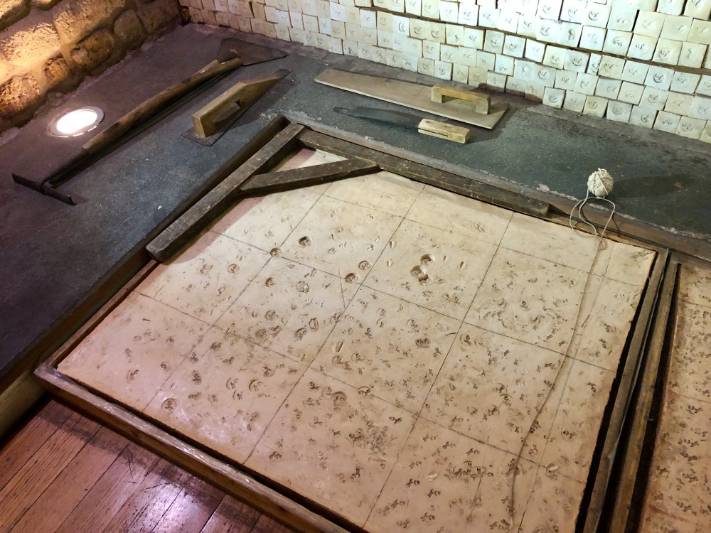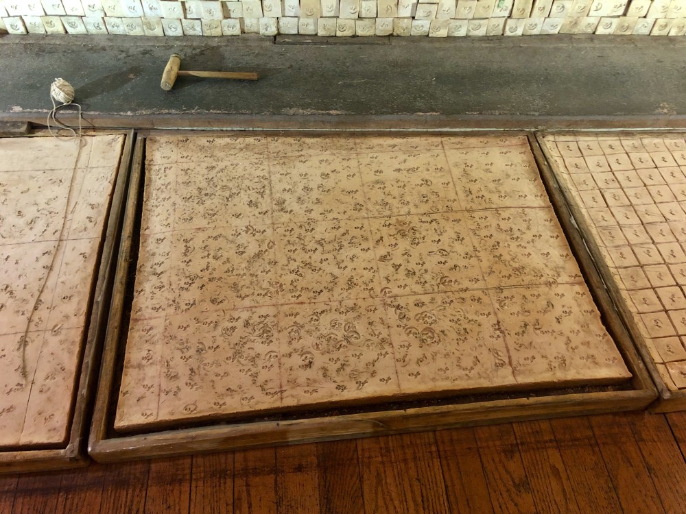 Dans l’aire d’étendage, la pâte est nivelée avec une spatule et l’épaisseur controlée à l’aide d’un étalon. 24H plus tard, le savon est quadrillé avec une ficelle imbibée de teinture rouge. Ensuite le savon est marqué, à l’aide d’un ou plusieurs poinçons, puis les ouvriers, chaussés de patins en bois pour préserver la surface du savon, découpent le savon suivant les tracés rouges.